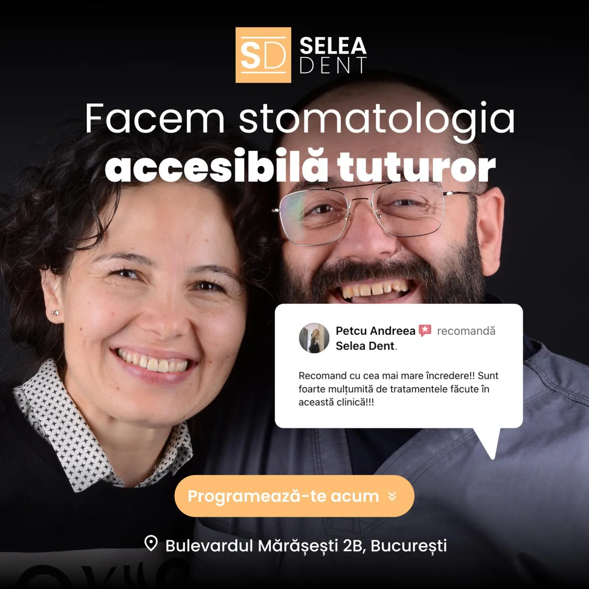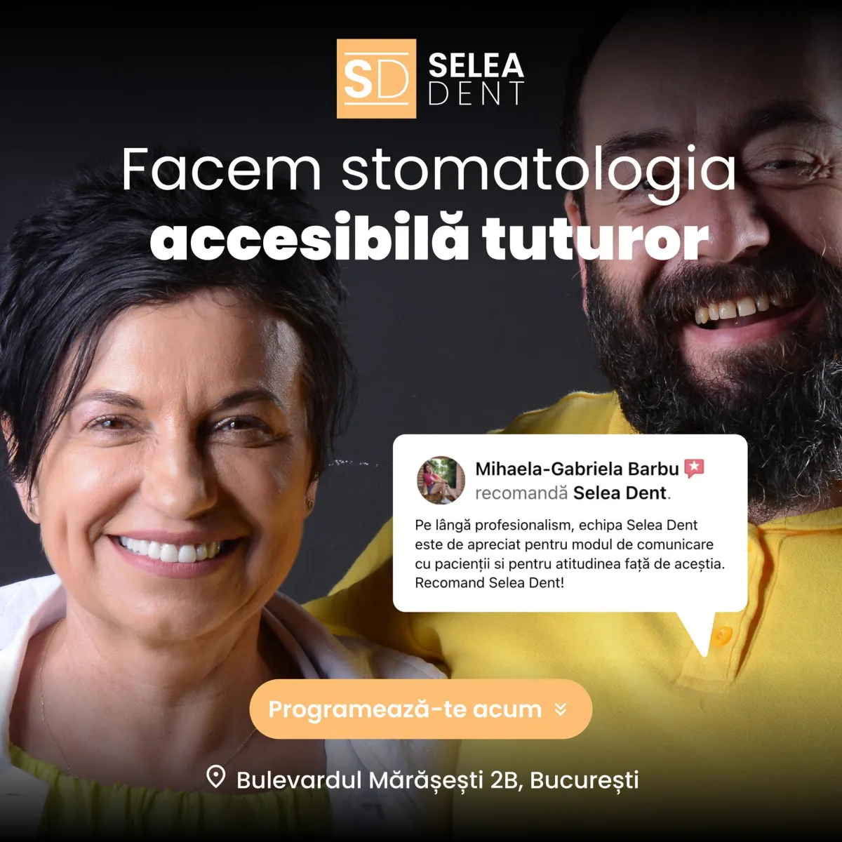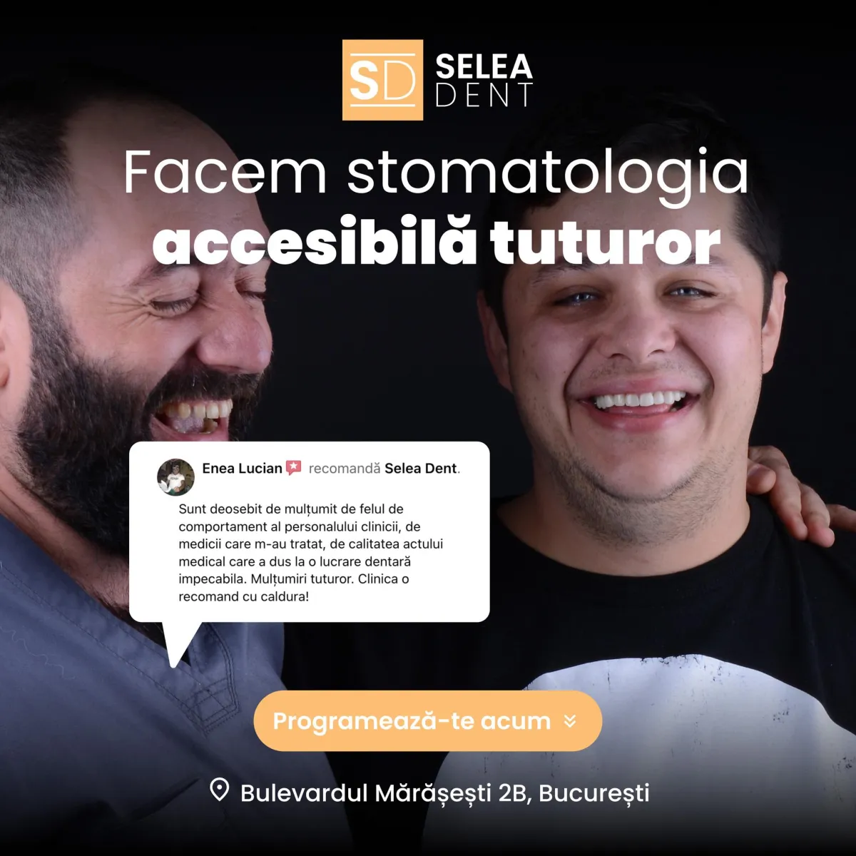 Deși suntem medici, ne place să spunem despre noi că suntem arhitecți de zâmbete. De fapt, ceea ce facem noi prin prisma meseriei de medici stomatologi este de a le reda pacienților două dintre cele mai importante aspecte ale vieții: sănătatea și încrederea în sine! La Selea Dent – totul într-o singură zi!