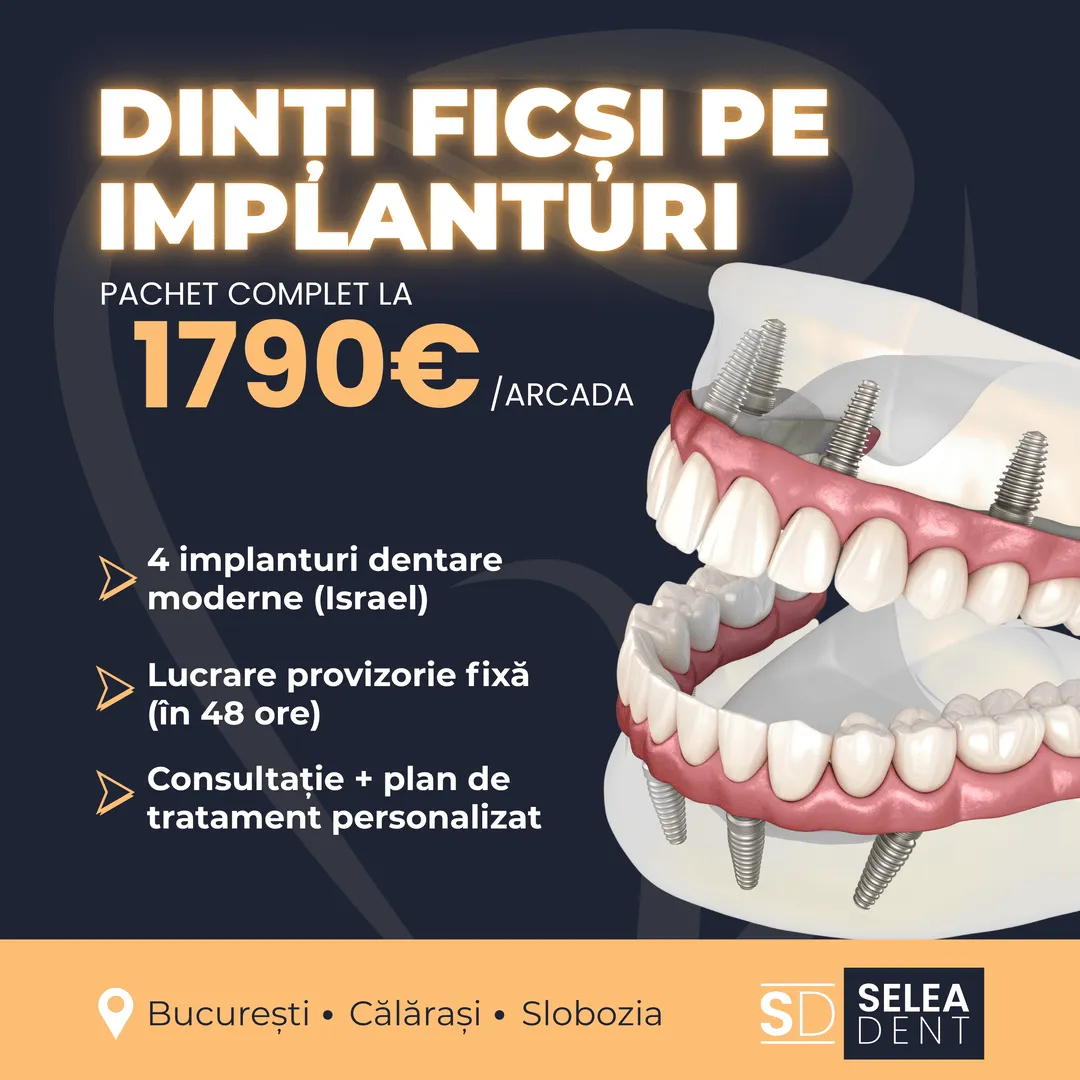 Pentru o perioadă limitată de timp beneficiezi de un VOUCHER din valoarea planului de tratament pentru reabilitări complexe pe implanturi și un preț special de 1.790€ pentru 4 implanturi + lucrare fixă provizorie.